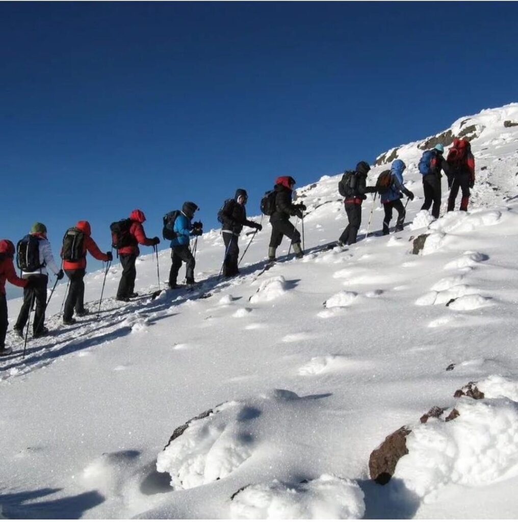 Final ascent to the summit, will have to start at around midnight. Your tent crew will wake you up with tea/coffee and biscuits. This part of your hike is done at night in order to reach Gillman’s Point around first light(+/- 6 hours from Kibo huts).You have to completely be prepared as this will be by far the most difficult part of your hike, as it will entail you not only hiking on a slope of loose gravel, but also be doing so at altitude. You have to remember that you have to constantly be on the move and only take short breaks every 2 hours or so to avoid getting cold. Your climbing gear that you have on should be able to assist your body to warm itself, and to keep cold wind out, but when not moving this becomes more difficult.